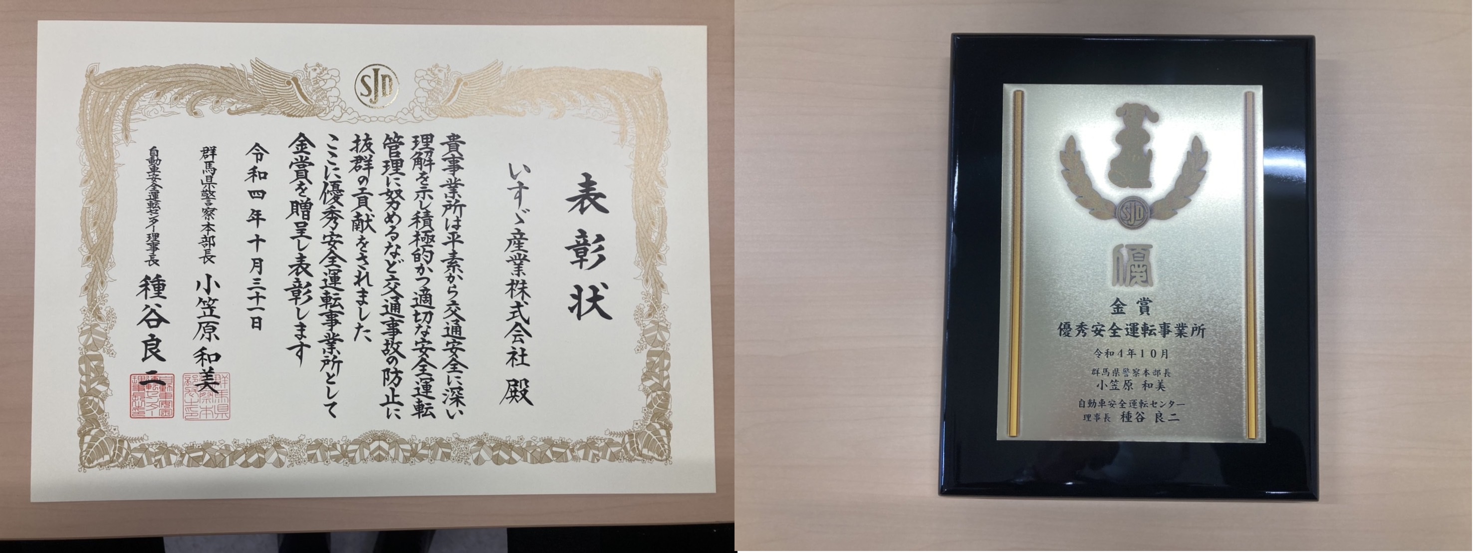群馬県警並びに自動車安全交通センターより優秀安全運転事業所として金賞の贈呈、表彰を受けました。